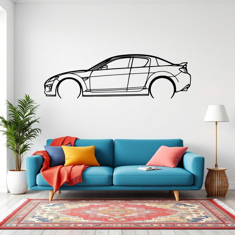 Wyjątkowa dekoracja ścienna przedstawiająca RX 8 Detailed w formie precyzyjnie wyciętej, metalowej sylwetki. Idealna dla miłośników klasycznej motoryzacji i minimalistycznego designu.