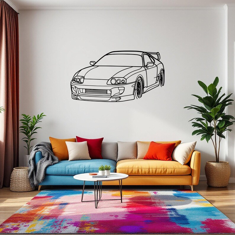 Wyjątkowa dekoracja ścienna przedstawiająca Supra 1994 Angle w formie precyzyjnie wyciętej, metalowej sylwetki. Idealna dla miłośników klasycznej motoryzacji i minimalistycznego designu.