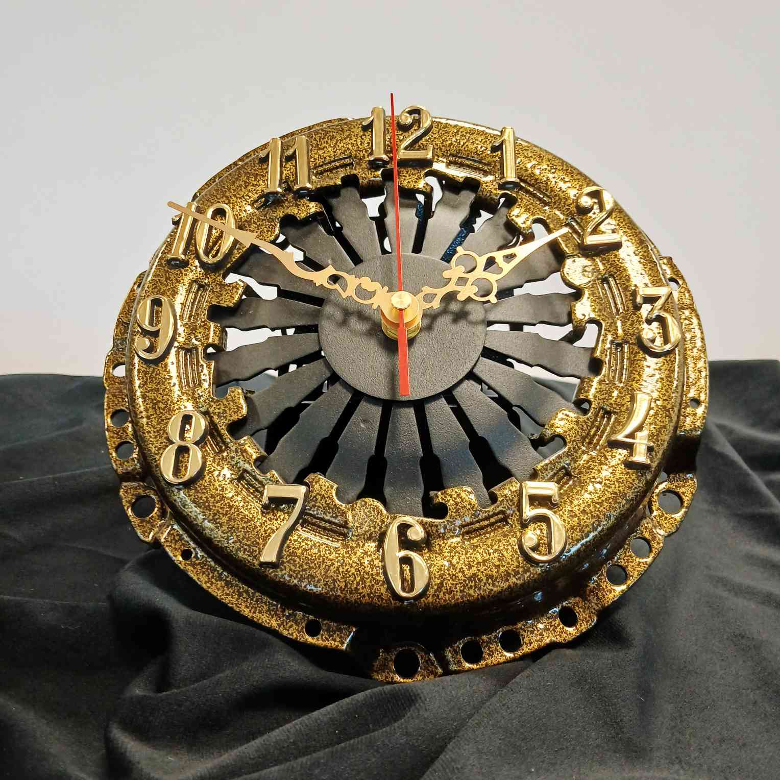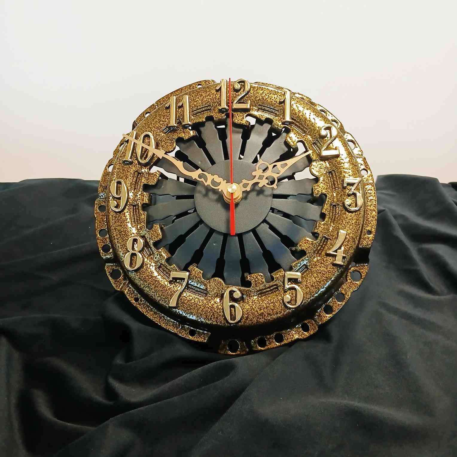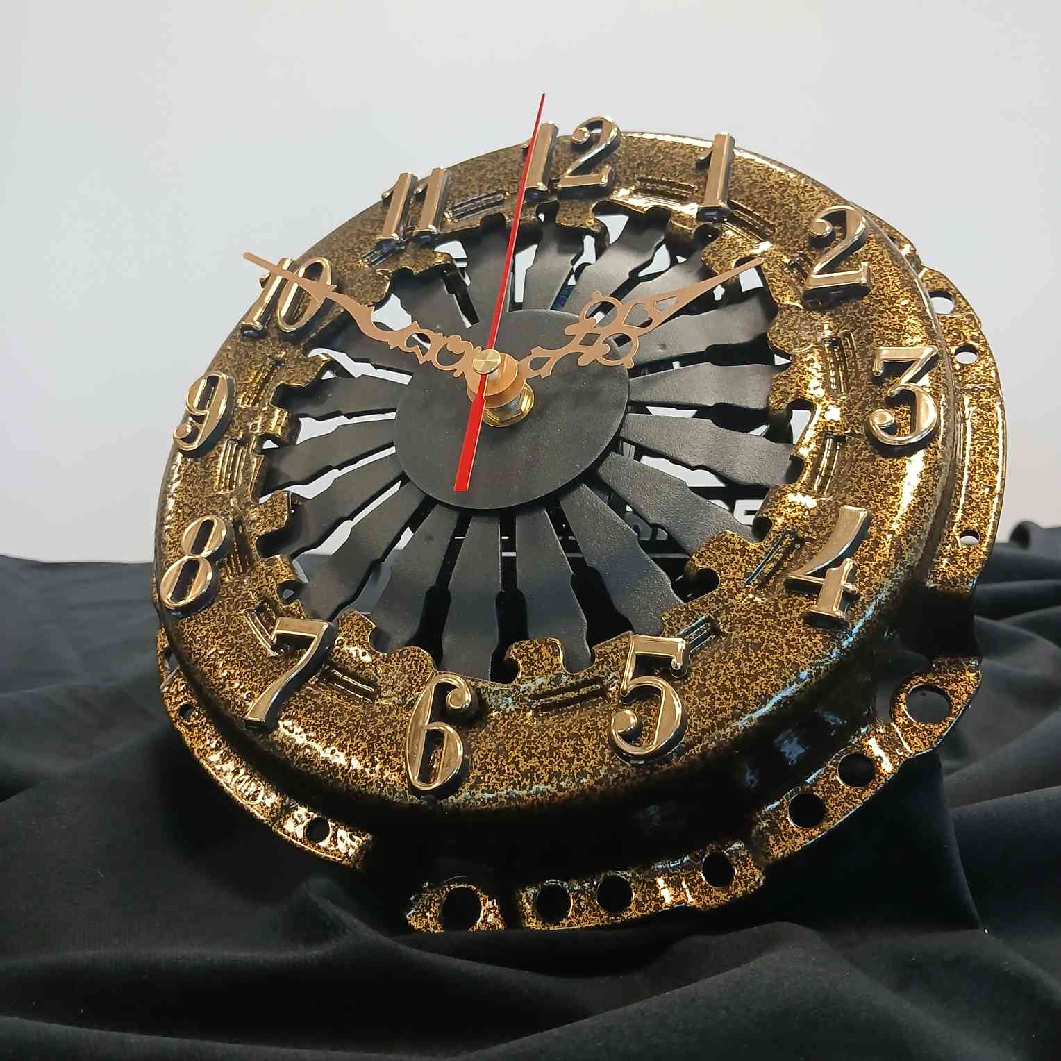 Nie każdy zegar ma takie „sprzężenie z rzeczywistością”. Ten model to prawdziwa perełka dla fanów motoryzacji – wykonany z autentycznego docisku sprzęgła, który nie raz przyjmował moment obrotowy na klatę, a dziś… po prostu odmierza czas.